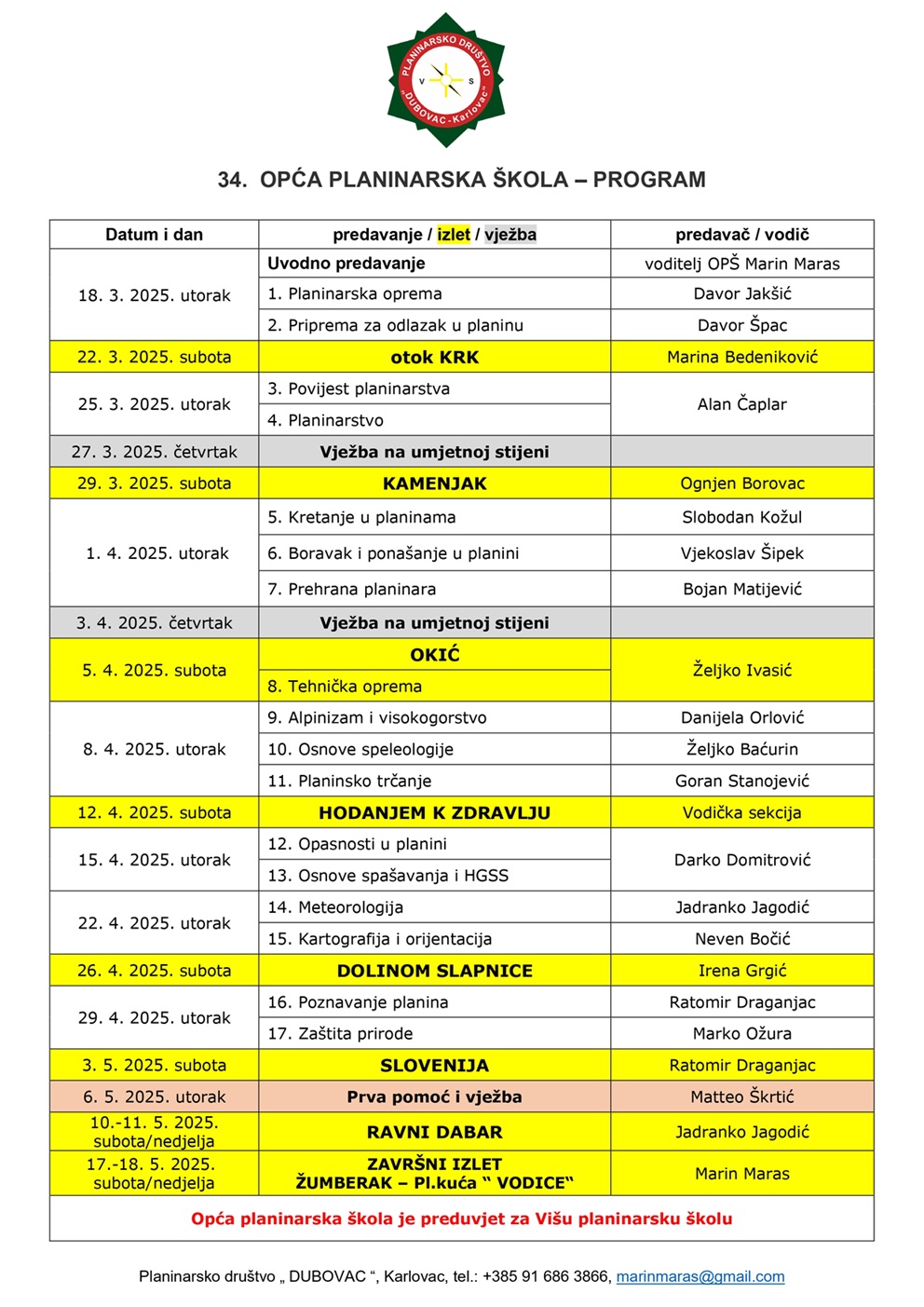 Predavanja, vježbe i izlete održavaju i vode iskusni planinari, vodiči, alpinisti i speleolozi, instruktori HPS-a i Hrvatske gorske službe spašavanja.