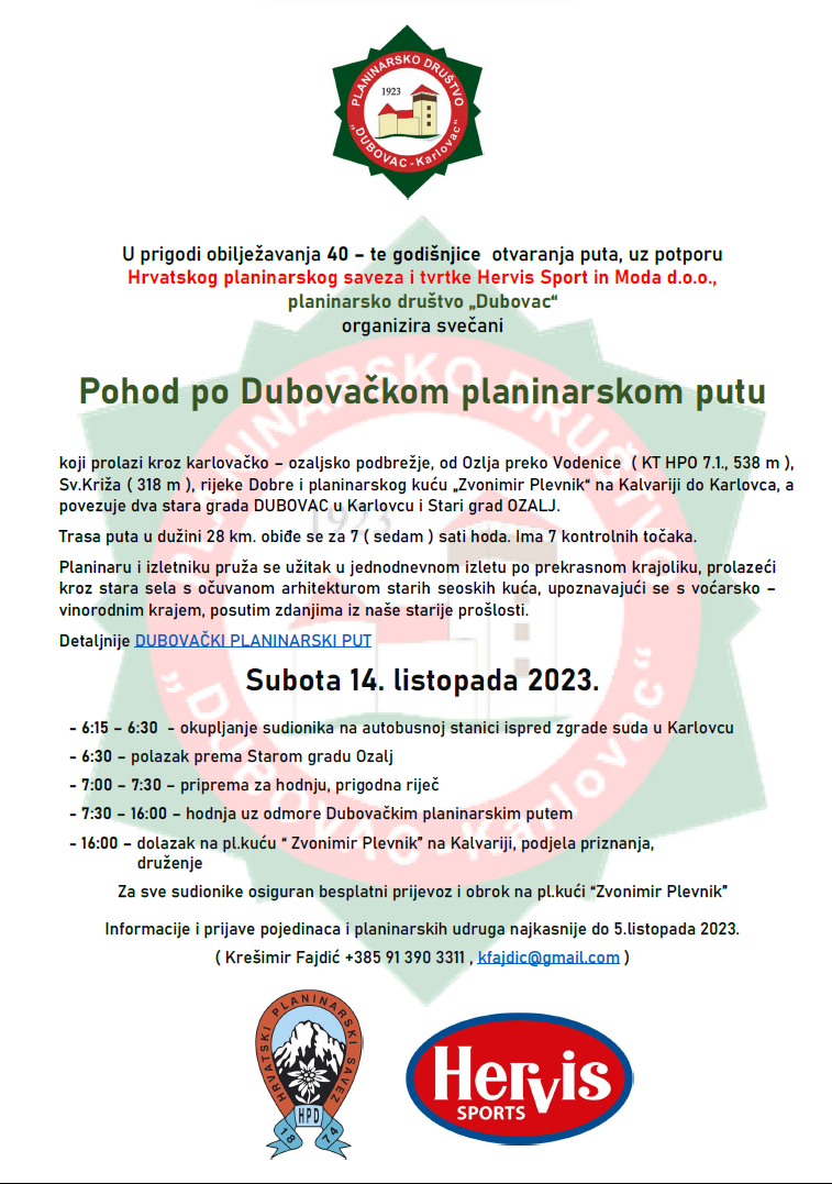 IZVJEŠTAJ: Ovogodišnja, tradicionalna listopadska hodnja po Dubovačkom planinarskom putu protekla je u znaku obilježavanja 40.obljetnice otvaranja puta koji prolazi kroz karlovačko – ozaljsko podbrežje, od Ozlja preko Vodenice ( 538 m ), sv.Križa ( 318 m ), rijeke Dobre i Pl.kuće „ Zvonimir Plevnik “ na Klavariji do Karlovca, povezuje dva stara grada Dubovac u Karlovcu i stari grad Ozalj.