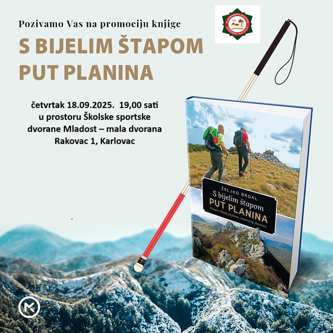 Pozivamo vas na predstavljanje knjige S bijelim štapom put planina autora Željka Brdala, strastvenog planinara i neumornog istraživača ljudskih mogućnosti. Ova inspirativna zbirka donosi tridesetak planinarskih putopisa u kojima autor, unatoč potpunom gubitku vida, svjedoči o svom neustrašivom pohodu na planinske vrhove diljem Hrvatske i šire.